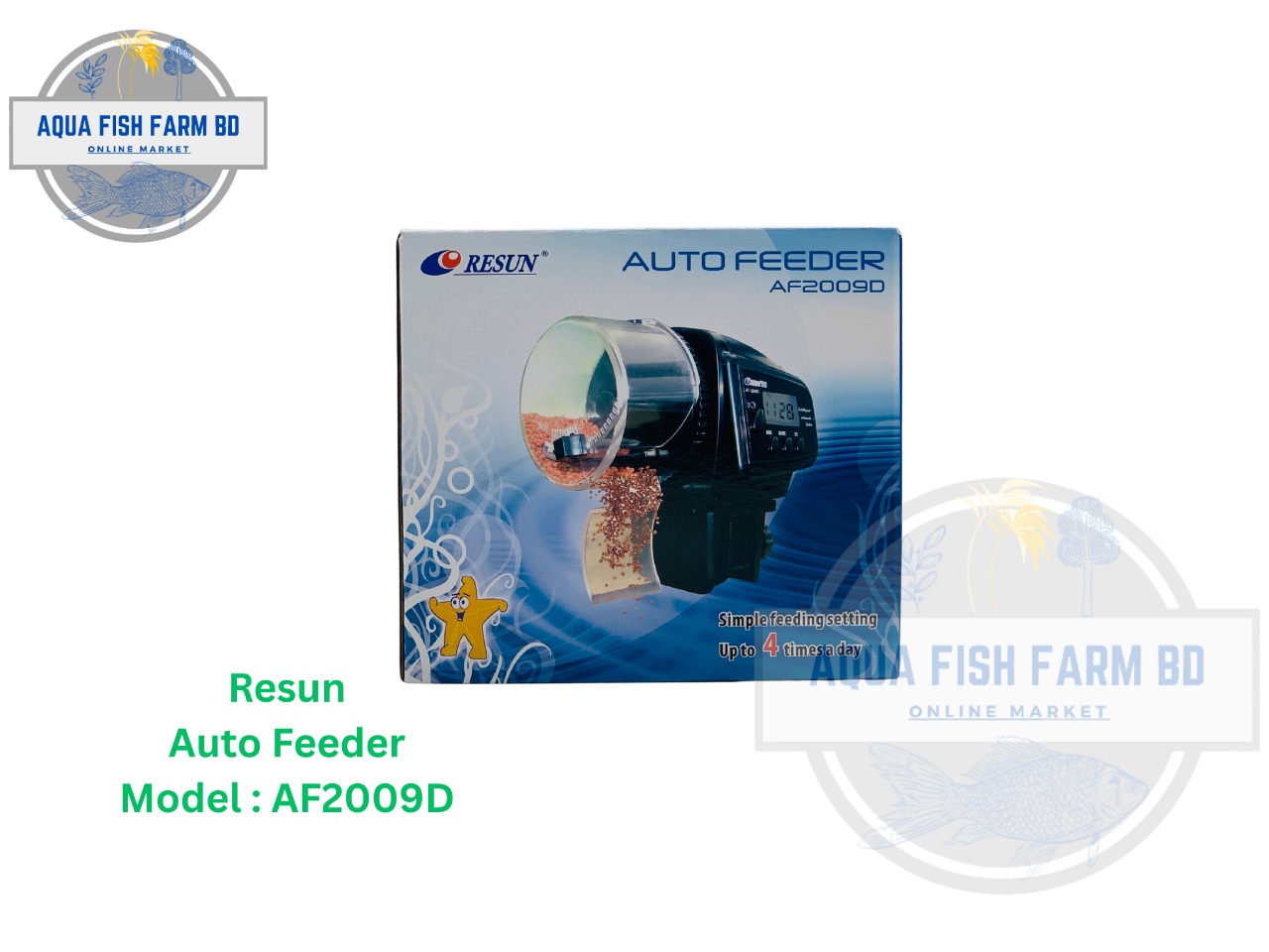 Resun Auto Feeder Model : AF2009D Digital LCD Display. Size : Small. Feeding Time : 4 Times A Day. Customized & Adjustable feeding Times. Power : AAA Battery 2 Pcs. Made In China.