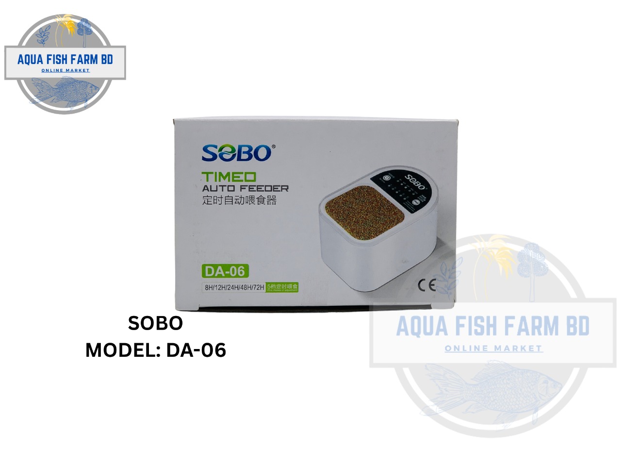 Sobo Auto Feeder Model : DA-06. Feeding Time : 8H, 12H, 24H, 48H, 72H. (Up To 5 Times) Power : AAA Battery 2 Pcs. Made In China.