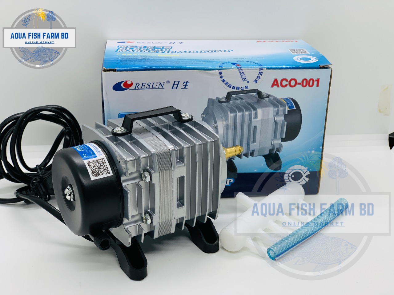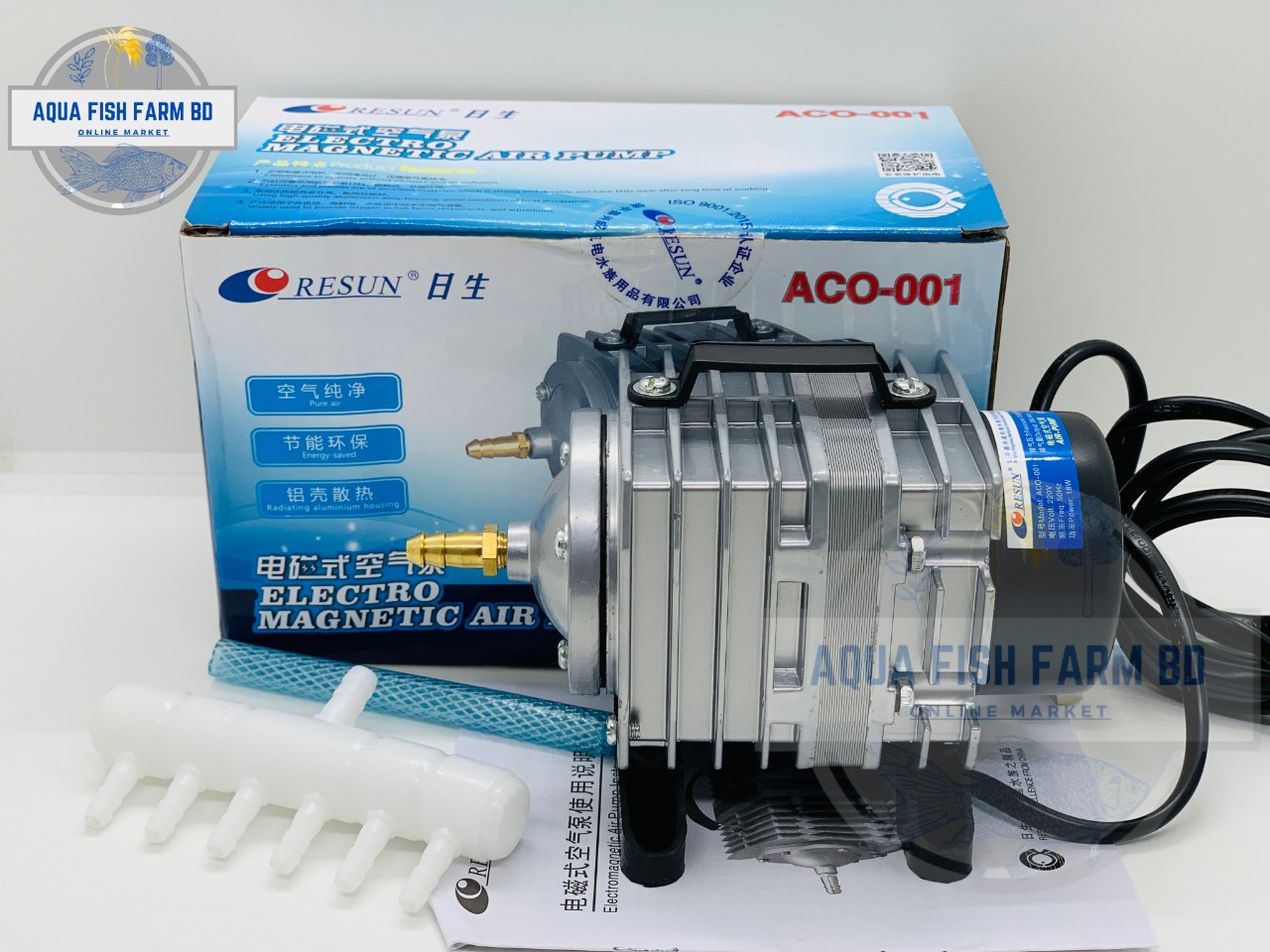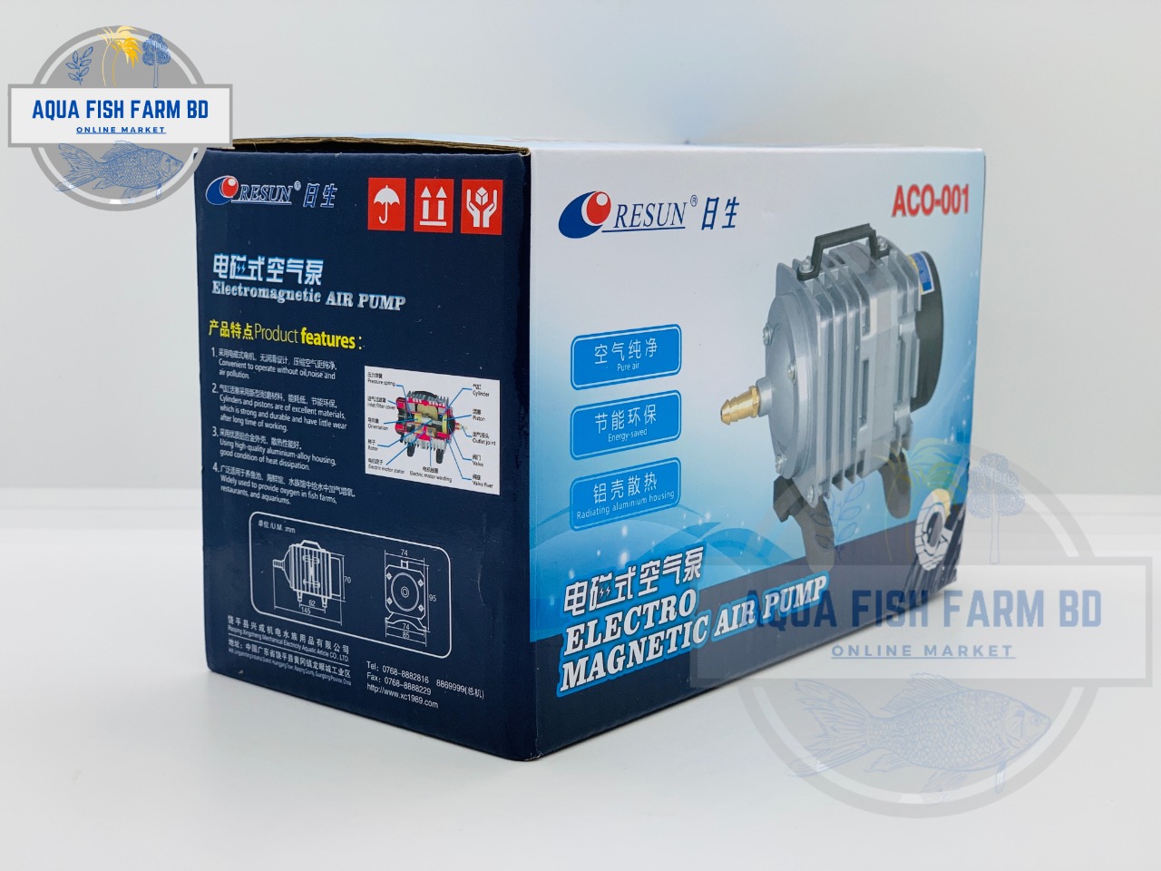 Resun, Electro Magnetic Air Pump, Model : ACO-001, Power : 18W, Pressure : 0.020MPa, Made In China.